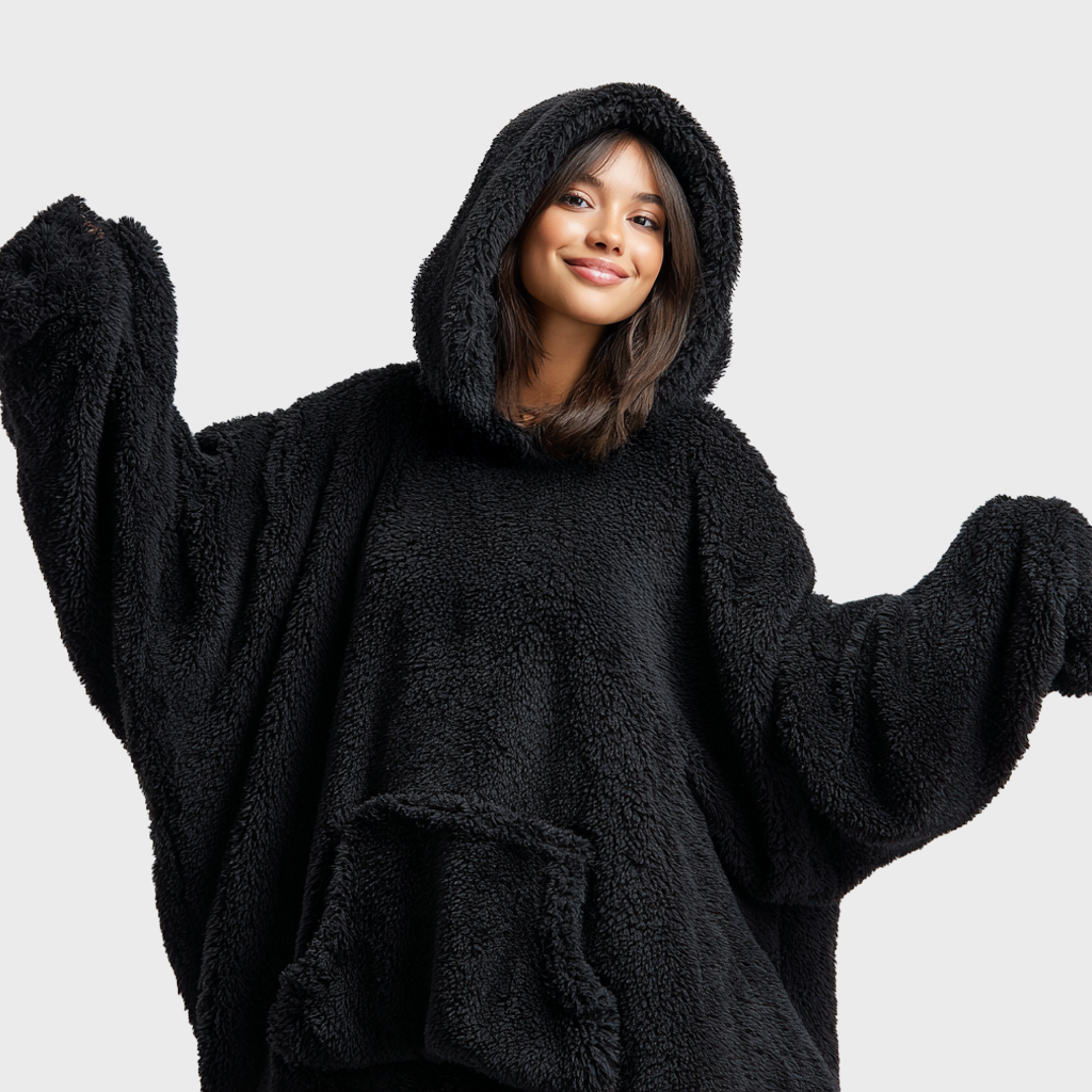 It has an oversized, relaxed shape with roomy sleeves and a loose blanket-style body, so it drapes naturally on all shapes and sizes. Think “one-size-fits-all”, cozy, and never restrictive.